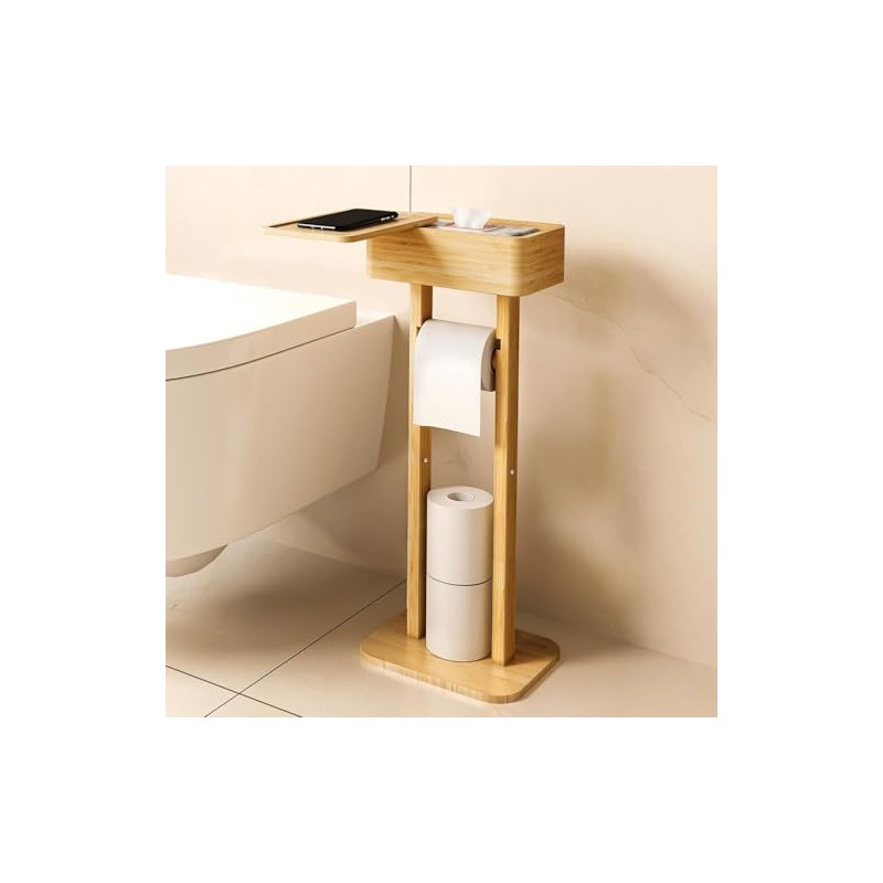 - Multifunctional Design: This free standing toilet paper holder designed with a storage box for personal items, ensuring privacy and cleanliness. The top lid of the box rotates 360° , serving as a temporary table for your phone, pad, book, and other item, easing hand and neck strain while keeping items secure and within reach