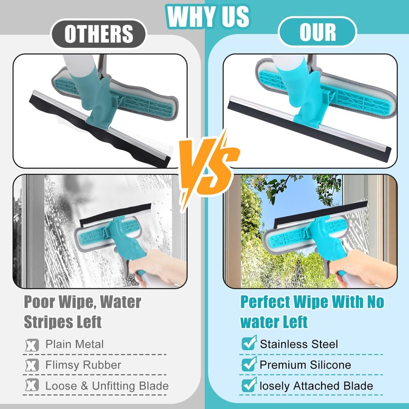 - 4-in-1 Window Cleaner Tool: Spray, Scrub, Squeegee & Dry in One. No more tool switching! Combines 4 essential functions (spray bottle, scrubber, squeegee, microfiber cloth) into a single, time-saving tool. Clean windows faster and smarter.