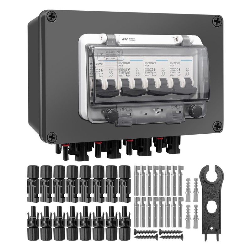 Solar Panel Disconnect Switch 4 String 32 Amp DC Circuit Breaker Box, Waterproof IP67 Solar Combiner Box with MC4 Connectors for Grid-Connected and Off-Grid Systems, 4 in 4 Out
