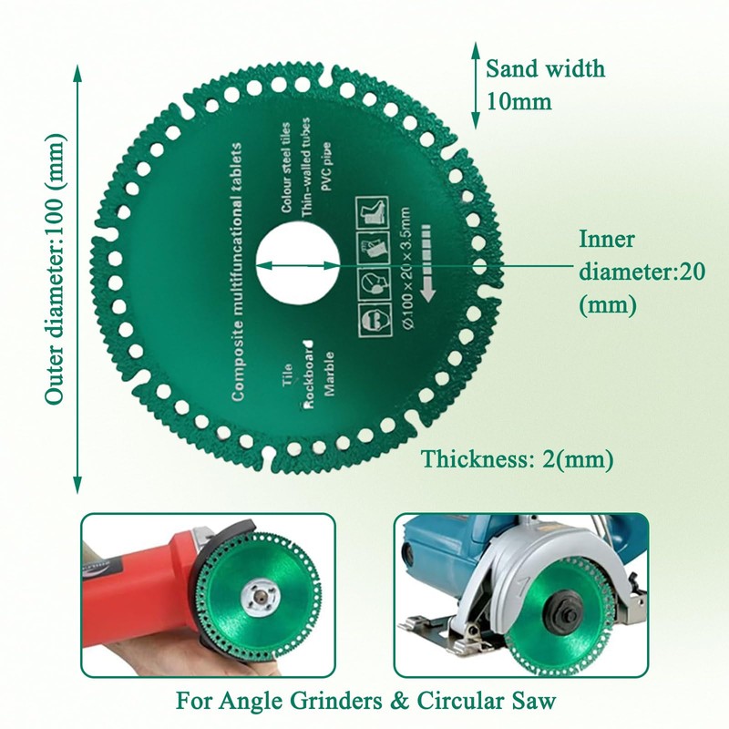 - 【Size】This angle grinder wood cutting discs size is 4 inches (100 mm) in diameter, 0.1 inches (3.5 mm) in thickness, and the inner hole size is 20 mm. It is easily compatible with most 100-type angle grinders on the market. Whether for home or professional use,stone cutting disc for angle grinder can provide precise and stable cutting results