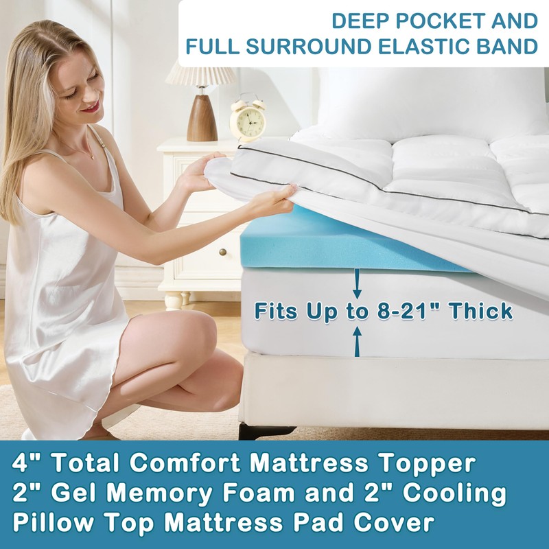 - 4 INCH THICK 2-IN-1 ADJUSTABLE DUAL-LAYER DESIGN: This soft plush dual-layer 4 inch memory foam mattress topper consists of a 2-inch quilted breathable pillow top mattress topper and a 2-inch cooling gel memory foam. We have upgraded the filling combed fiber from the standard 600gsm to 800gsm, providing a more perfect skin-friendly softness and double the all-around support. Slow-rebound memory foam conforms to the contours of the body, maintaining its shape and firmness to provide a cloud-like sleeping experience.