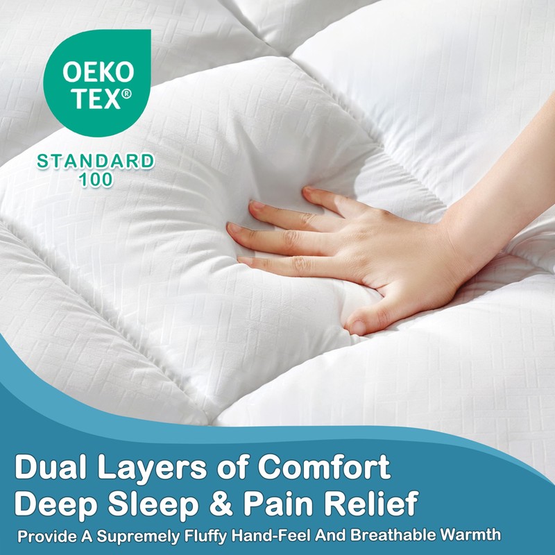 - IMPROVE SLEEP, SLEEP SOUNDLY ALL NIGHT: This mattress topper for back pain relief is made from 400TC combed 3D & 7D fibers, offering soft comfort with a three-dimensional internal structure that ensures a fluffy, soft, and skin-friendly feel. It also features moisture-wicking and temperature-regulating properties. Additionally, the memory foam is designed with a cooling effect, keeping you comfortable all night long, alleviating stress and pain, and allowing you to enjoy a peaceful night's sleep.