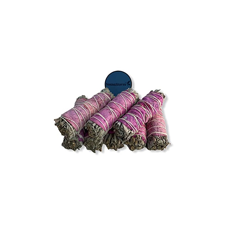 4-Inch Floral Sage Smudge Stick – Hand-Tied, Long-Lasting Burn, All-Natural & Ethically Sourced for Home Cleansing and Happiness Promotion. (6 Pack, White Sage w/Pink Petals 4")