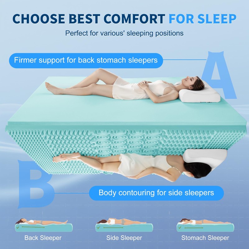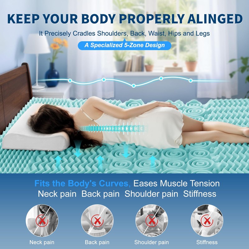- 【5-Zone Targeted Support】The innovative egg crate memory foam is engineered into 5 zones to provide differentiated support for your shoulders, back, waist, hips, and legs. This promotes proper spinal alignment, reduces pressure points, and helps alleviate back pain for a more restorative sleep.