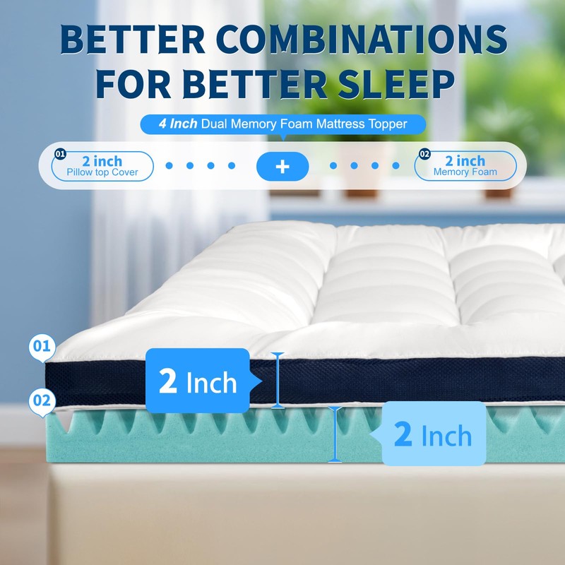 - 【Dual-Layer Luxury Design】Experience the perfect balance of plush softness and ergonomic support. Our topper combines a 1000GSM quilted pillow top (filled with down-alternative fiber) for cloud-like comfort and a 2-inch 5-zone egg crate memory foam layer that strategically supports different body areas for optimal pressure relief.