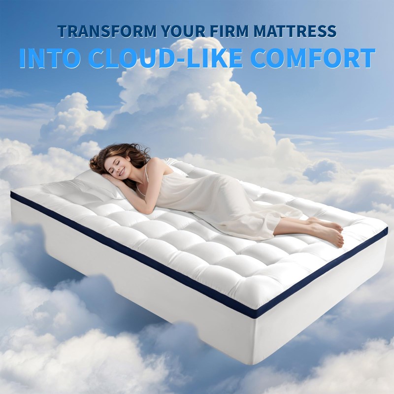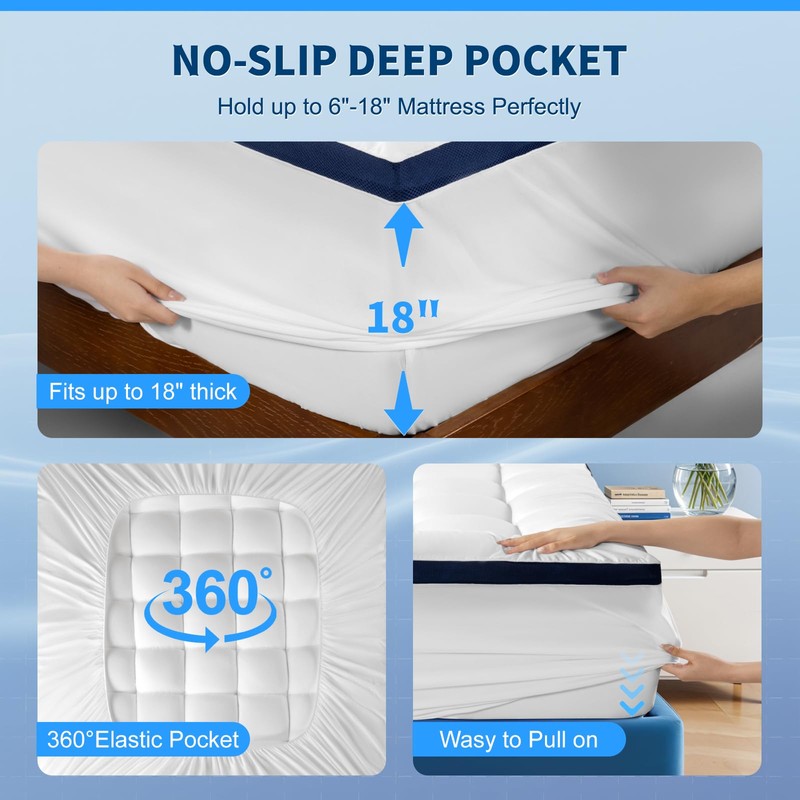 - 【Secure Fit & Premium Upgrade】Designed as a full mattress encasement (fitted sheet style) with deep pockets and elastic all around, it ensures a snug, non-slip fit on mattresses up to 18 inches. Instantly transforms an old, firm, or uncomfortable mattress into a luxurious, hotel-quality sleep surface.