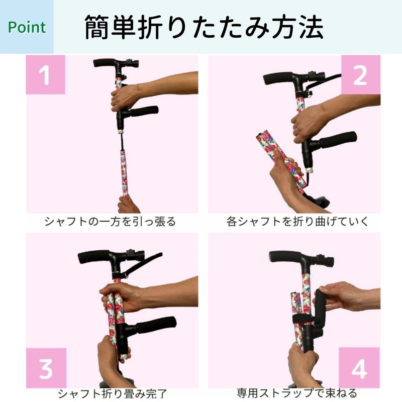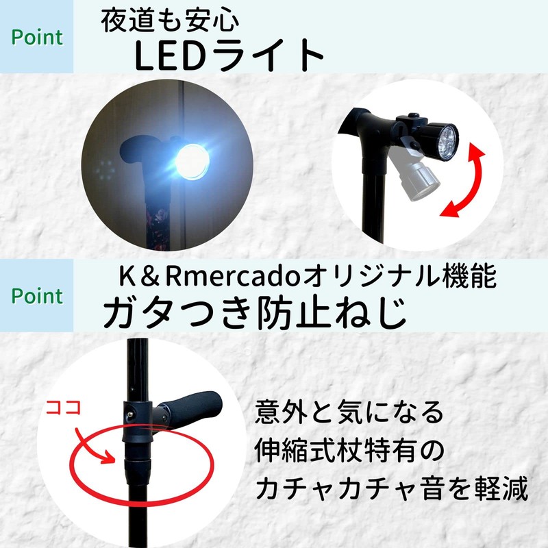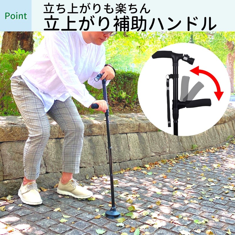 - 【便利な機能がたくさん】 ◆【ライト搭載】で暗い夜道も安心。車からも存在を確認しやすくて安全です。夜間トイレで起きた際も、足元を照らすことができるので便利です。 ◆【4点式のゴム脚】でしっかりと地面を捉えます。自立式ですので手を放しても大丈夫! ◆【5段階伸縮機能付き】伸び縮みできるのでピッタリな長さの調整が可能 ◆【軽量、折りたたみ式】折り畳み式で持ち運びが楽々。◆折りたたみできる2ハンドル式です。立ち上がる際は両手で杖を握ることができ、下ハンドルで横ブレを防止しながら安全に立ち上がることができます。