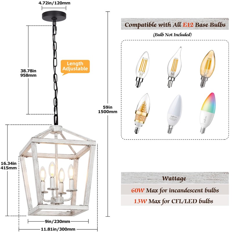 - E12 Bulb Required: The entryway light fixture comes with 4 x E12 lamp holder, you could optionally choose any E12 bulbs to use with, such as LED/CFL(13W max), incandescent(60W max) or fluorescent (Bulb not included). Just screw the bulb in to brighten up your home, flexible and various, it's easy to create different indoor atmosphere by changing the bulb you prefer.