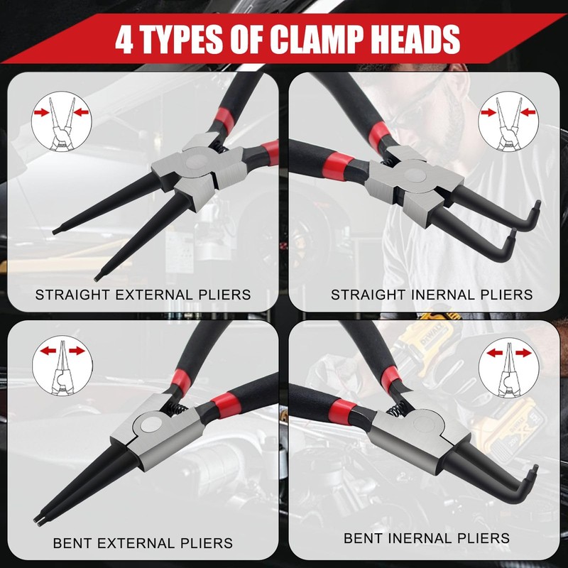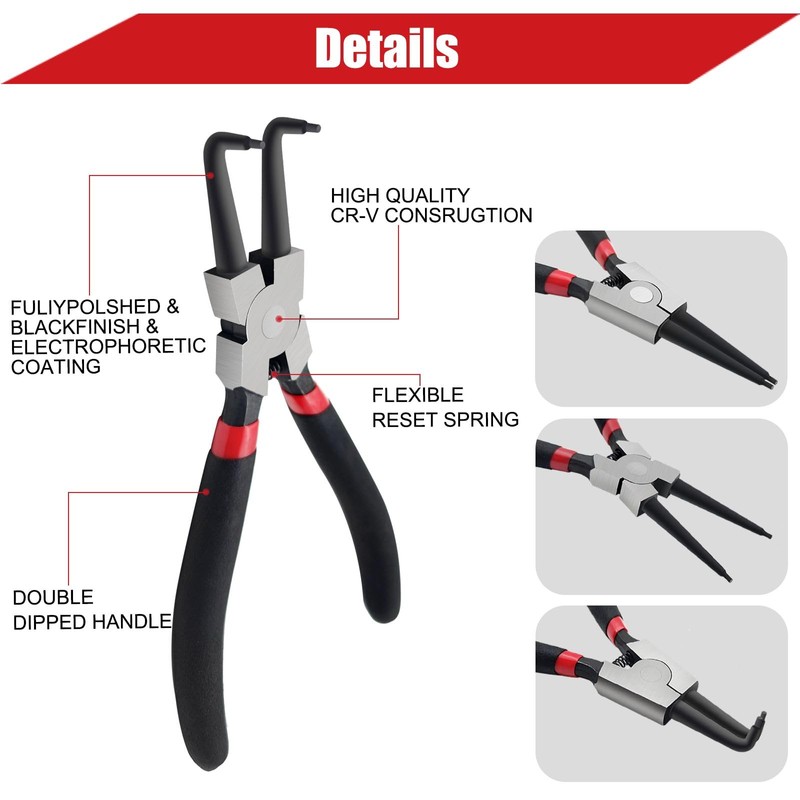 - High Quality Material - Our heavy duty snap ring pliers are made of industrial grade #45 carbon steel with high hardness and durability. forged, heat treated, polished and coated with black oxide protective film finished to prevent rust and improve corrosion resistance.