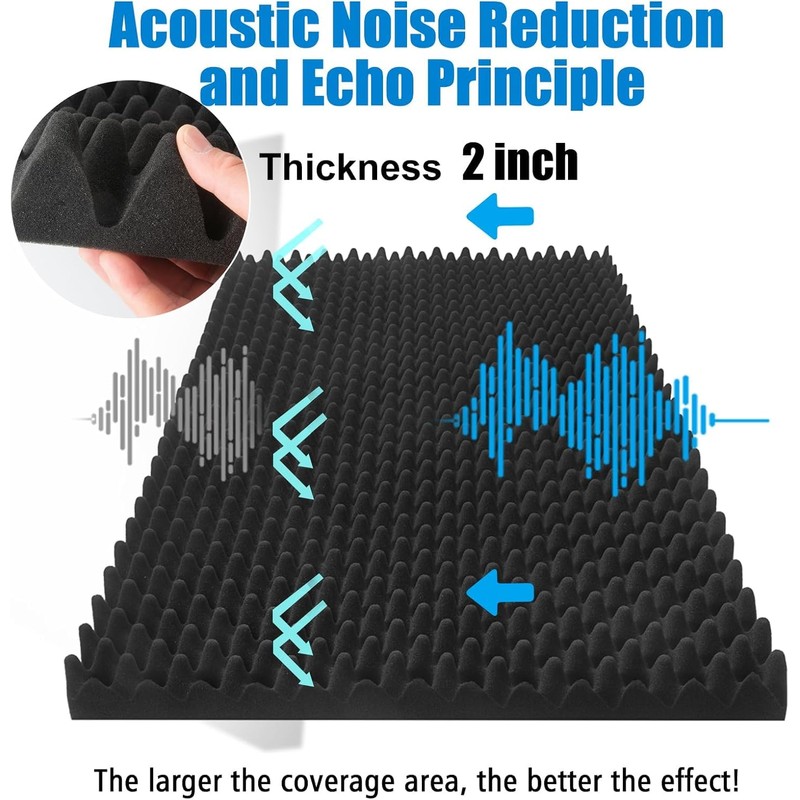 - 【Flame-Retardant Foam】 48*24*2 inch Egg Crate Acoustic Foam.Compared to 1-inch panels, 2-inch panels offer a greater advantage in sound-absorbing treatment.these soundproof wall panels are crafted from high-quality polyurethane high-density flame-retardant foam.Better sound absorption and safety.