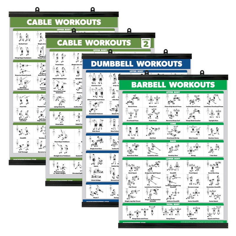 4 Pack - Cable Machine Workout Posters Volume 1 & 2 + Dumbbell Exercises + Barbell Exercises (LAMINATED WITH PLASTIC FRAME 18" x 24")