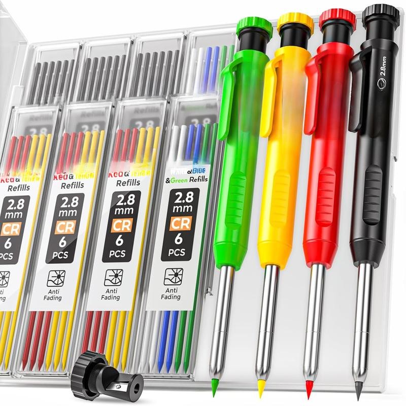 Valued Construction Pencil Set: You will get 4 pack solid carpenter pencils with 52 2.8 mm refills, 1 replaceable sharpener, 1 plastic storage box.The complete carpenter pencils combination allows you to finish your work faster and more easily