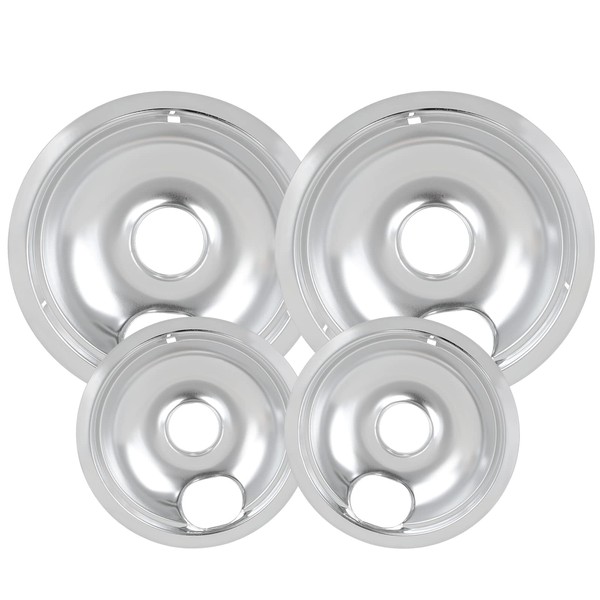 - [Set of 4 Drip Pans] : This chrome burner drip pan replacement set includes 2 x 6 inches drip bowls and 2 x 8 inches burner drip pans. Dimension: 6 '' pans diameter measured 7.5 inch, 8'' measured 9.5 inch. Please check the size before buying.