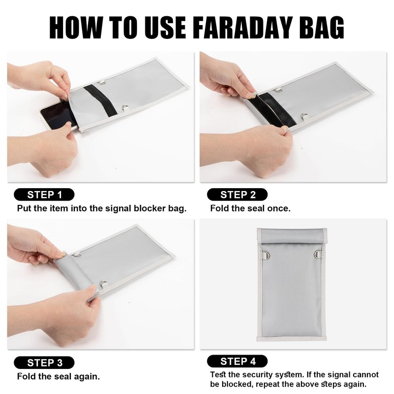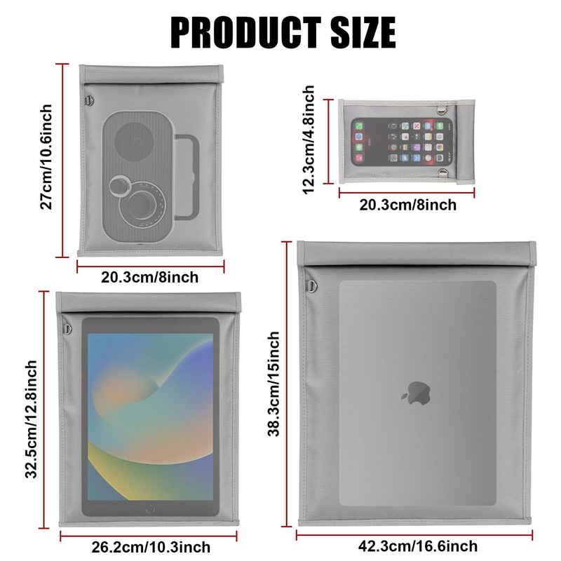 - Meet different needs - There are four sizes of emp bags for faraday. Small size: 7.87 x 4.72 inches; Medium size: 10.63 x 7.87 inches; Large size: 12.99 x 10.23 inches; Maximum size: 16.9 x 14.96 inches. Four different sizes of Faraday bags can be used for loading keys, credit cards, cash, mobile phones, radios, GPS devices, tablets, laptops, duplicate data files and so on