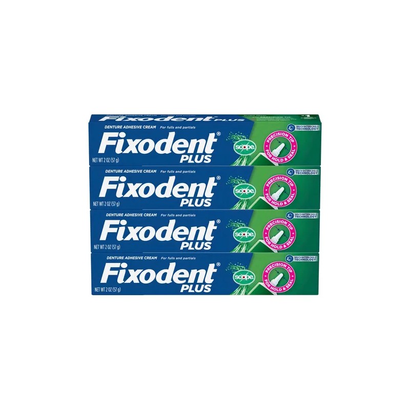 Descripción Limpia: Recibirá cuatro tubos de adhesivo para dentaduras postizas Fixodent Plus Scope.