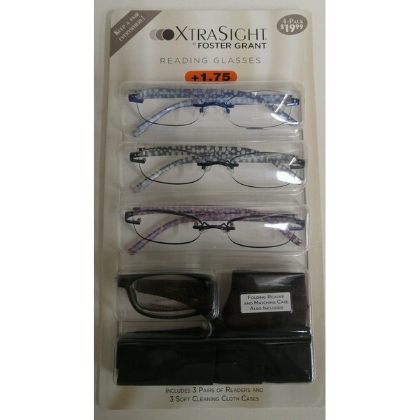 4 Pack FOSTER GRANT Tamara READING GLASSES +1.75 With 3 Soft Cloth Cases and Tortise Color Folding Reader NEW