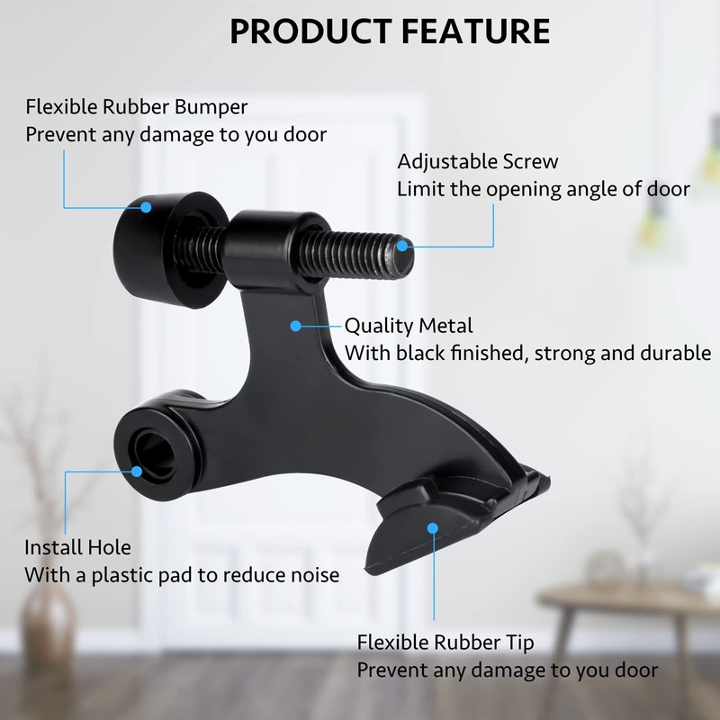 - Quality Material: These hinge door stopper are made of metal of zinc alloy with black finished, exquisite and elegant, strong and durable. The rubber bumper is flexible and smooth to help protect your door knob or wall.