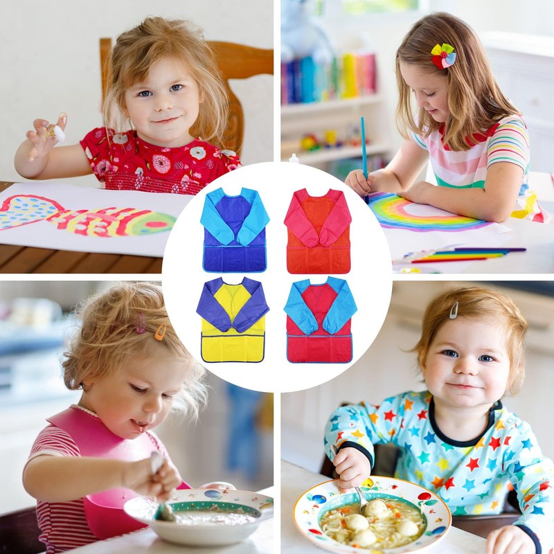 Packing List: You Will Receive 4 Pieces of Children's Art Aprons in Different Colors, Which Are Red, Yellow, Blue and Pink, Bright and Lively. The Aprons Are the Same Style, and the Sleeves Are Color-blocking Designs.