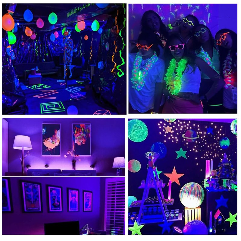 • 【Standard UVA Spectrum】395-400nm wavelength led blacklight fixture, used for glow parties, small clubs, halloween decoration, blacklight poster display, Aquarium lighting and fishing. Great for illuminating most blacklight reactive pigments, paints and dyes. Especially with neon-colored objects, the blacklight works super cool for UVA body paint and other visible fluorescent materials.