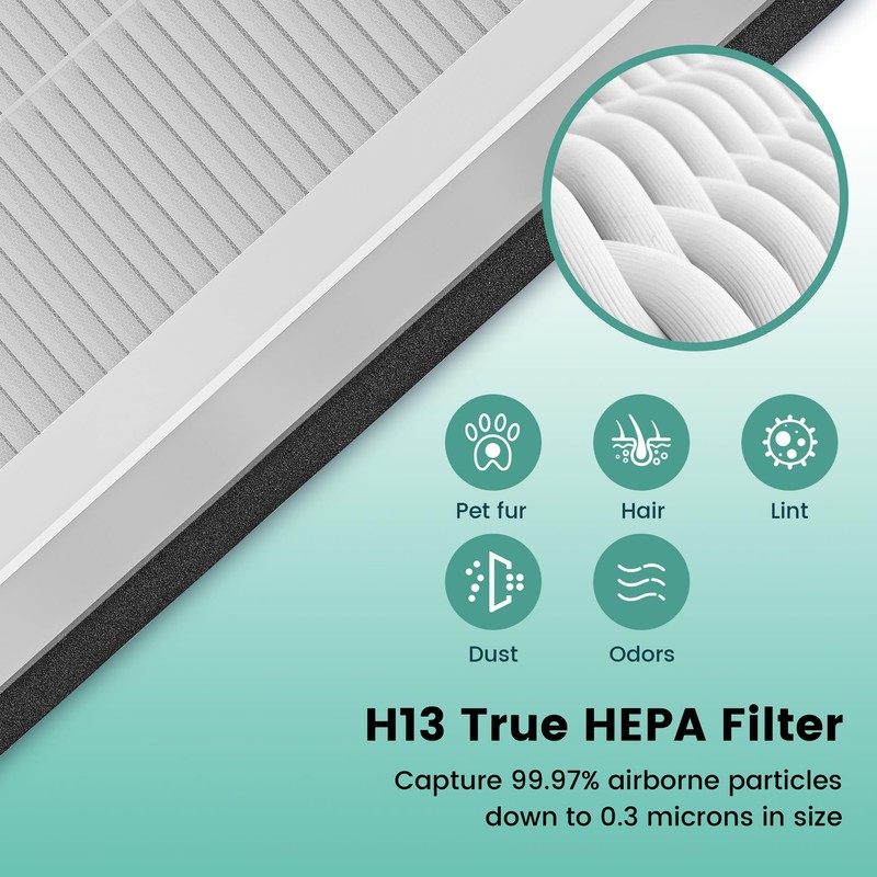 - H13 True HEPA Filter: Capture 99.97% of ultra-fine particles below 0.3 microns
