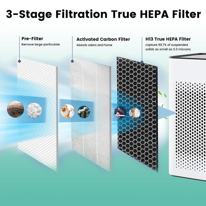 - Advanced 3-Layer Filtration: Our filter features a 3-layer filtration system: Fine preliminary filter, H13 True HEPA filter and activated carbon filter