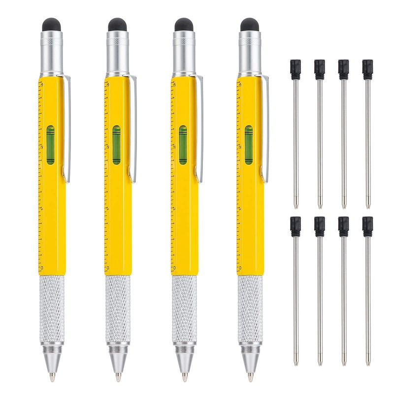 4 Pack Multitool Pen with Extra Refills Set, 6 in 1 Multitool Pen with Ruler & Slotted Screwdriver, Multifunctional Metal Ballpoint Pen, Cool Gadget for Men, Great Gift for Husband Dad Father (Yellow)