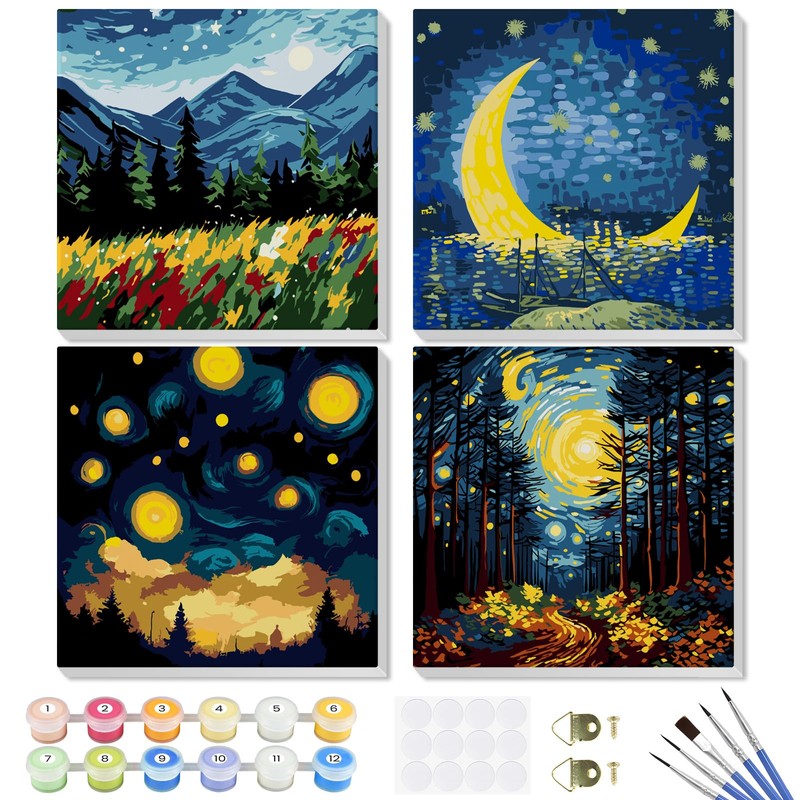 - 【Product Feature】Paint by numbers for adults with wooden frame canvas, landscapes diy oil painting pattern. We offer 4 pc pre-printed textured art canvas, 4 set acrylic paints, 4 set paint by numbers brushes, 8 hook nails, 24 self adhesive dots. You can hang your masterpiece on the wall for display.
