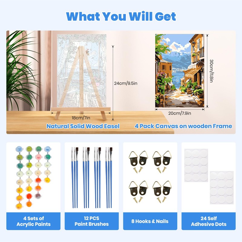 - What You Will Get: Paint by numbers for adults framed canvas with wooden easel, flower door landscapes diy oil painting pattern. 4 pack pre-printed textured art canvas on frame(size: 8x12 inch), 1 pc wooden easel, 4 set of high-quality acrylic paint, 12 pcs paint by numbers brushes, a manual, 8 hook nails and 24 self adhesive dots. You can hang your masterpiece on the wall for display
