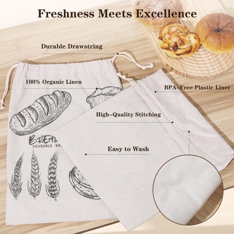 - 【Keep Your Homemade Bread Fresher for Longer】Our reusable bread bags for homemade bread are designed to keep your bread fresher longer compared to 100% linen bread bags and cotton saver cloth bags. With a BPA-free plastic lining, our sourdough bread bags provide an optimal environment for bread storage, preserving its freshness and flavor.