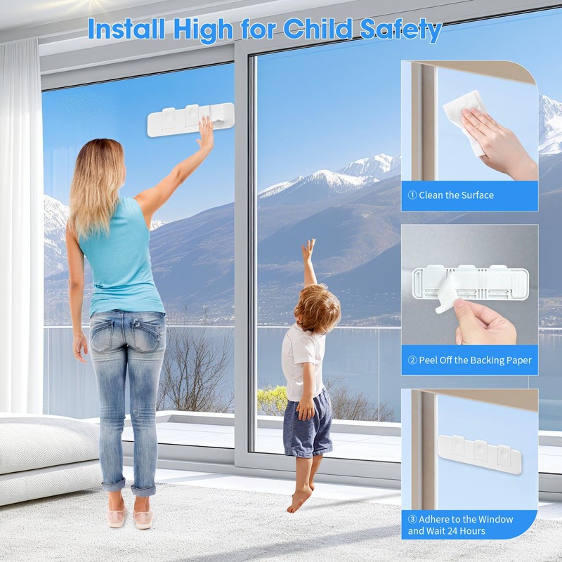 - Easy to Install and Use: No tools or drilling required—select the desired position, clean the surface, apply the adhesive, and wait 24 hours for full adhesion. For optimal safety, install the sliding door lock high out of reach of children. Push the lock downwards to block movement or push it upwards to allow passage.