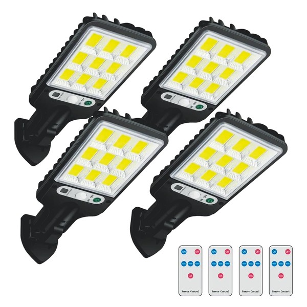 Illuminate your outdoor space with this versatile 4-pack of solar-powered LED lights. Each unit features bright LED panels arranged in a 3x3 grid configuration, providing powerful illumination for your yard, pathway, or security needs. The lights come with convenient remote controls for easy operation and include motion sensor capability for automated lighting. The durable black housing is designed for wall mounting and weather resistance. These wireless lights harness solar energy during the day and automatically activate at night, offering a practical lighting solution without complex wiring. The included remote controls allow you to adjust settings from a distance, while the motion detection feature helps conserve power when no activity is detected. Perfect for enhancing security around your home's perimeter, lighting up walkways, or brightening dark corners of your property. The sleek modern design complements any outdoor décor while providing functional illumination where you need it most.