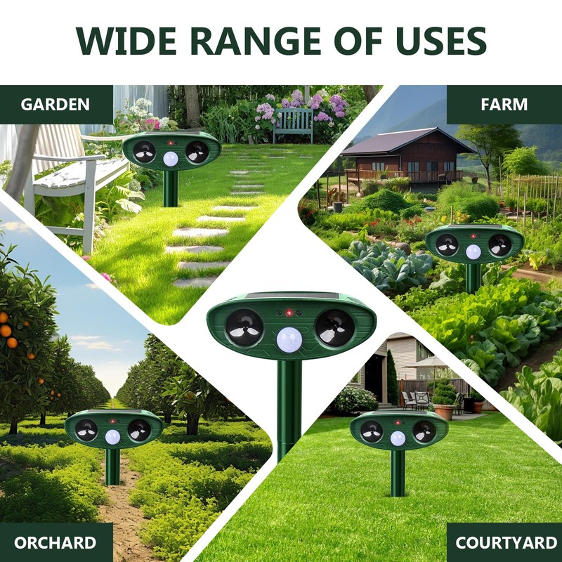 A2: This repellent combines solar power, ultrasonic technology, and motion detection. When the motion sensor detects an animal approaching, it automatically triggers ultrasonic waves and a deterrent light. The high-frequency sound waves and light stimuli, which are uncomfortable for animals, drive them away without causing harm.