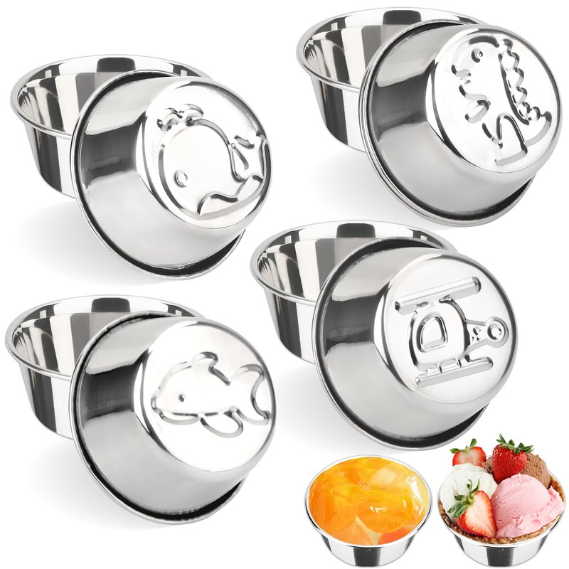 4 Pack Stainless Steel Pudding Cups,4oz Small Jello Molds with Cute Animal Pattern,Rust-Proof Multi-Purpose Kitchenware,Reusable Dessert Cups for Baking,Gelatin,Ice Cream,Chocolate,Dishwasher-Safe
