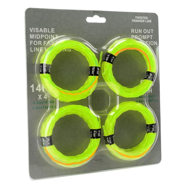 4-Pack String Trimmer Line .095 Compatible with Ego String Trimmer 095 Weed Eater String Pre-Cut Dual Color 3-Section Fast-Positioning Twisted Trimmer Line Universal Fit Weed Wacker String 14 ft