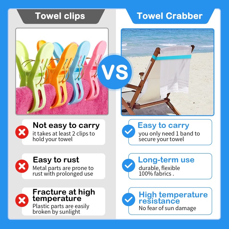 - Prevents Towel Slippage: Towel bands hold your towel securely in place, preventing it from sliding off your beach chair or blowing away in the wind.