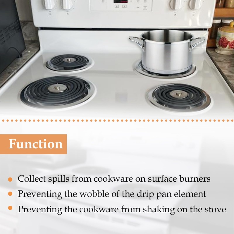 - 【Function】: The drip pan can collect spills from cookware on surface burners, such as oil/water drips/food that spilled during cooking. The drip pan can be perfectly matched to the stove, preventing the wobble of the drip pan element, thus preventing the cookware from shaking on the stove, and ensuring safe cooking.