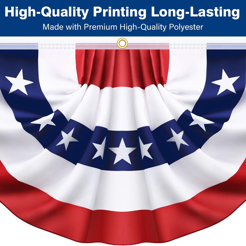- Versatile Decoration: American Flag Bunting Perfect for displaying on your porch, railing, garden, window, backyard, company, street, door, tree, and more, our American fan flags are a great way to show your patriotism on 4th of July Independence Day, Memorial Day, Veteran's Day, and other special occasions. Half Fan Bunting Flags Made of 100% Polyester Made in China