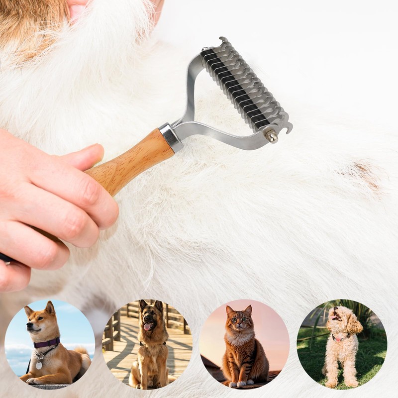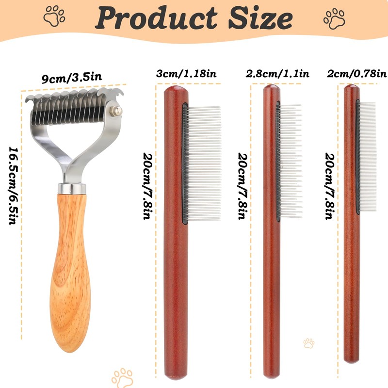 - All-in-One Grooming Kit: The HIMODA pet grooming kit is your ultimate solution, featuring a metal dog and cat brush for shedding, dematting, and detangling, along with a wide-toothed dog comb and fine-toothed pet brush. With all four pet combs designed with comfortable wood handles, this set provides everything you need for comprehensive grooming