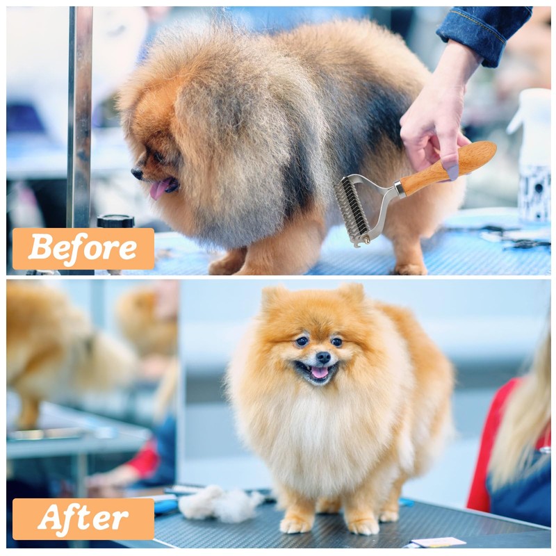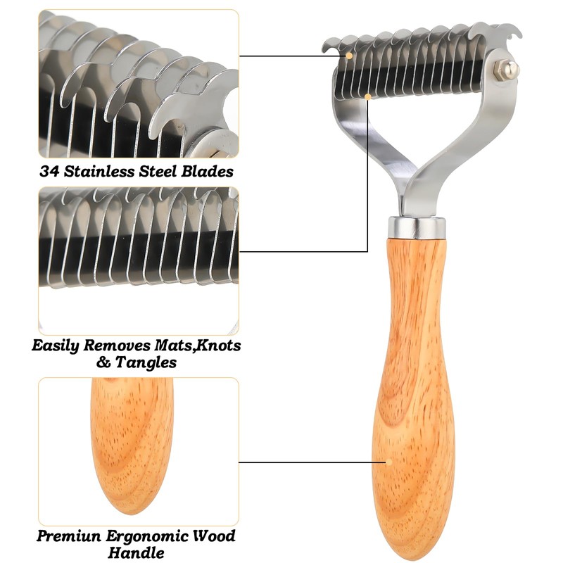 - Reduce Shedding Effectively: The double-sided undercoat rake is perfect for tackling shedding in medium to long-haired dogs and cats. With a 9-teeth side for removing stubborn mats and tangles, and a 17-teeth side for reducing heavy shedding, this versatile tool is essential for keeping your pet’s coat healthy and well-maintained