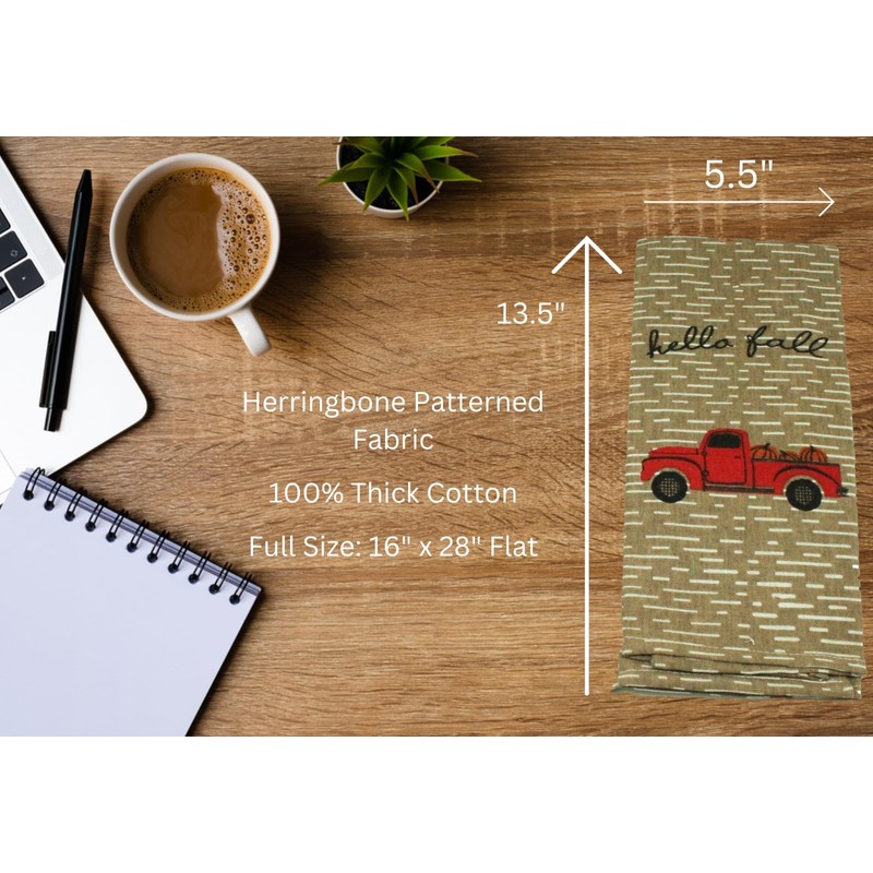 - Great 4 piece fall kitchen towel set that features a red vintage truck and Hello Fall sentiment. Matching fall pot holder and matching fall oven mitt complete the set.