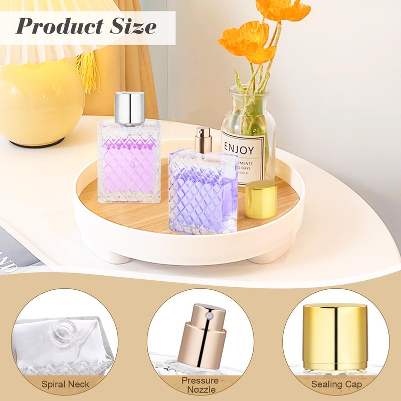 - Size: 11.8*6.3*3.3cm/4.65*2.48*1.3inch. Capacity: 100ml/3.4oz. Color: Clear body and silver cap/gold cap. Package: 4 pieces in gold and silver color. Better absorption, will not waste every drop of perfume.