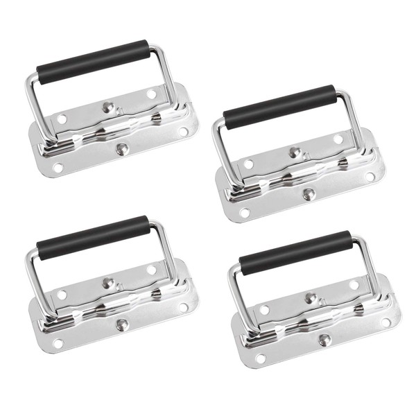 4 Pcs 304 Stainless Steel Folding Spring Handle with Black Rubber Grip Sleeve, 4 Holes for Storage Box, Flight Case
