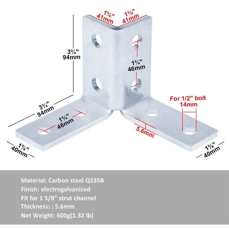 4 Pcs 8 Hole Wing Shape Double Corner 90 Degree Fitting Bracket for 1-5/8" Strut Channel