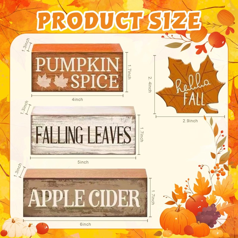 - Versatile Wooden Decor Sign Size: Maple leaf 2.9 x 2.4in, and 3 different sizes of fall wooden decor signs, 6 x 1.7 x 1.3in, 5 x 1.7 x 1.3in, 4 x 1.7 x 1.3in, you can freely combine them
