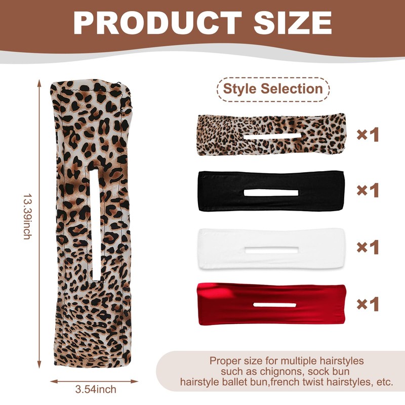 Product descriptionThe bun makers can be served to make hair donut bun, ballet bun, and French bun. Suitable for long, thick, thin, straight, curly hair.Category: Hair curlerColor: Red, black, White and brown leopard.Material: PolyesterItem Dimension: 34 x 9 cm/13.39x 3.54 inchesItem Weight: 46 gPackage Component: 4 pieces deft bun hair twister, one for each color.Function:1. Fashionable and magical bunny ear hairstyle design, polka dot decoration, cute and creative, a must-have headdress for women.2. Simple hair styling tool, can fix your hair well, simple and convenient to use, easily create your hairstyle.3. 4 different colors of french twist hair tool, can be perfectly matched with any clothing and any hair color, a ideal hair accessory for women, make you look very charming.