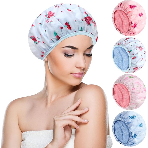 4 Pcs Lined Shower Caps Reusable Bath Caps for Women Waterproof Shower Soft Bath for Hair Care Dry Hair Women Ladies Girls Spa Salon (Flower and Cherry, One Size)
