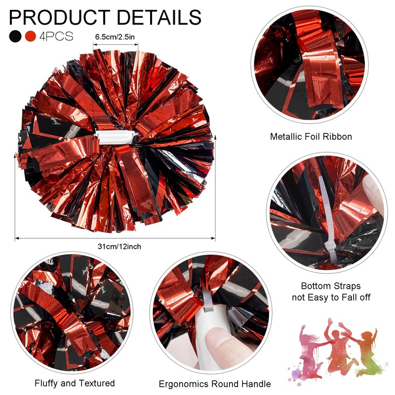 4 Pcs Metallic Cheerleading Pom Poms, ZONITOK Cheerleader Pompoms with Baton Handle, Cheering Squad Pompoms for Kids Adults School Dance Sports Team Spirit Cheering (Black Red)
