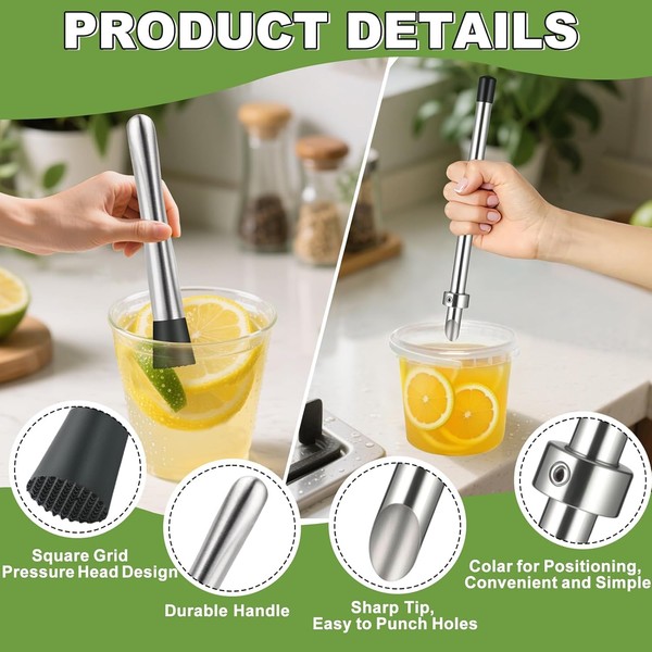 • Food Grade Materials - crafted from 304 stainless steel, both muddler and puncher ensure durability, rust-resistance, and safe, delicious drinks; The puncher's 12.7 mm hole and 22 cm length effortlessly pierce cups and lids for a nice straw fit