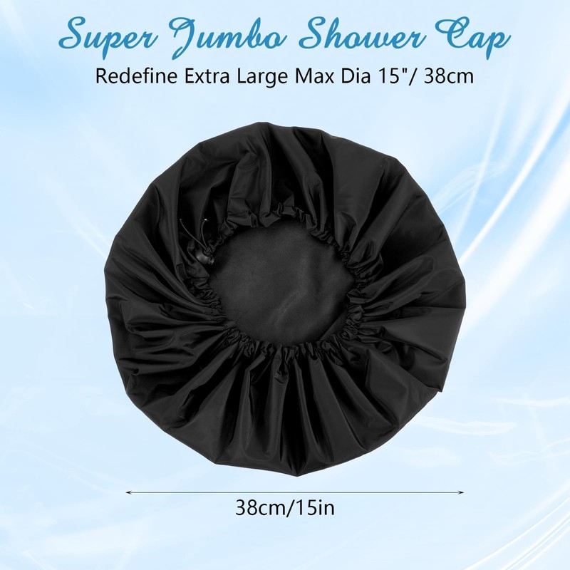 - [OUTSTANDING WATERPROOF PERFORMANCE] The outer layer of the big shower cap is made of thickened EVA which is 100% waterproof and more sturdy than common plastic. And more important, the edge of this bathing cap is upgraded to waterproof polyester, and the adjustable elastic band keeps the edge close to the head to prevent water slipping through the edge.