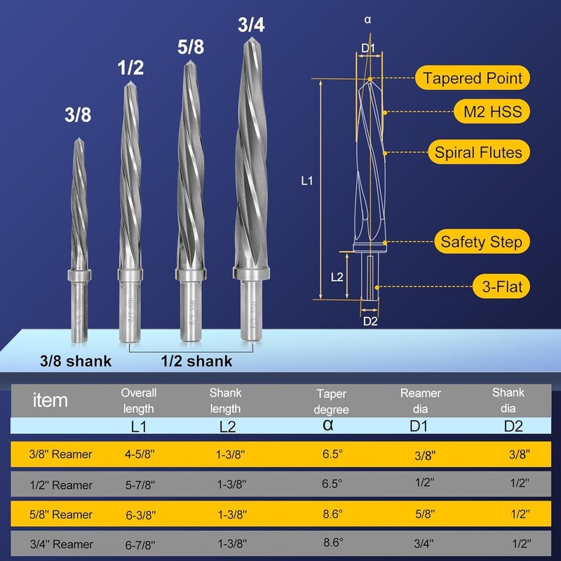 - 【Size】Set of 4 taper reamers with sizes 3/8", 1/2", 5/8", and 3/4", catering to various machining needs. The tapered point design allows them to effortlessly enter into the out-of-line overlapping holes and line them up, or enlarge the holes in the steering knuckles and pitman arms, ensuring a smooth installation of bolts or rivets.